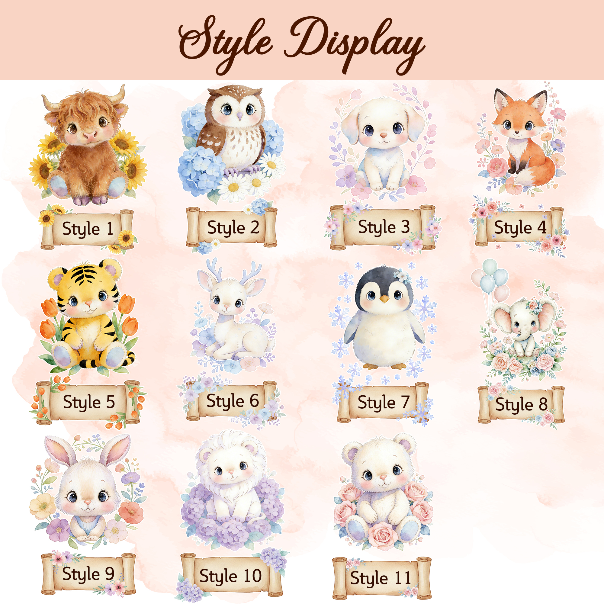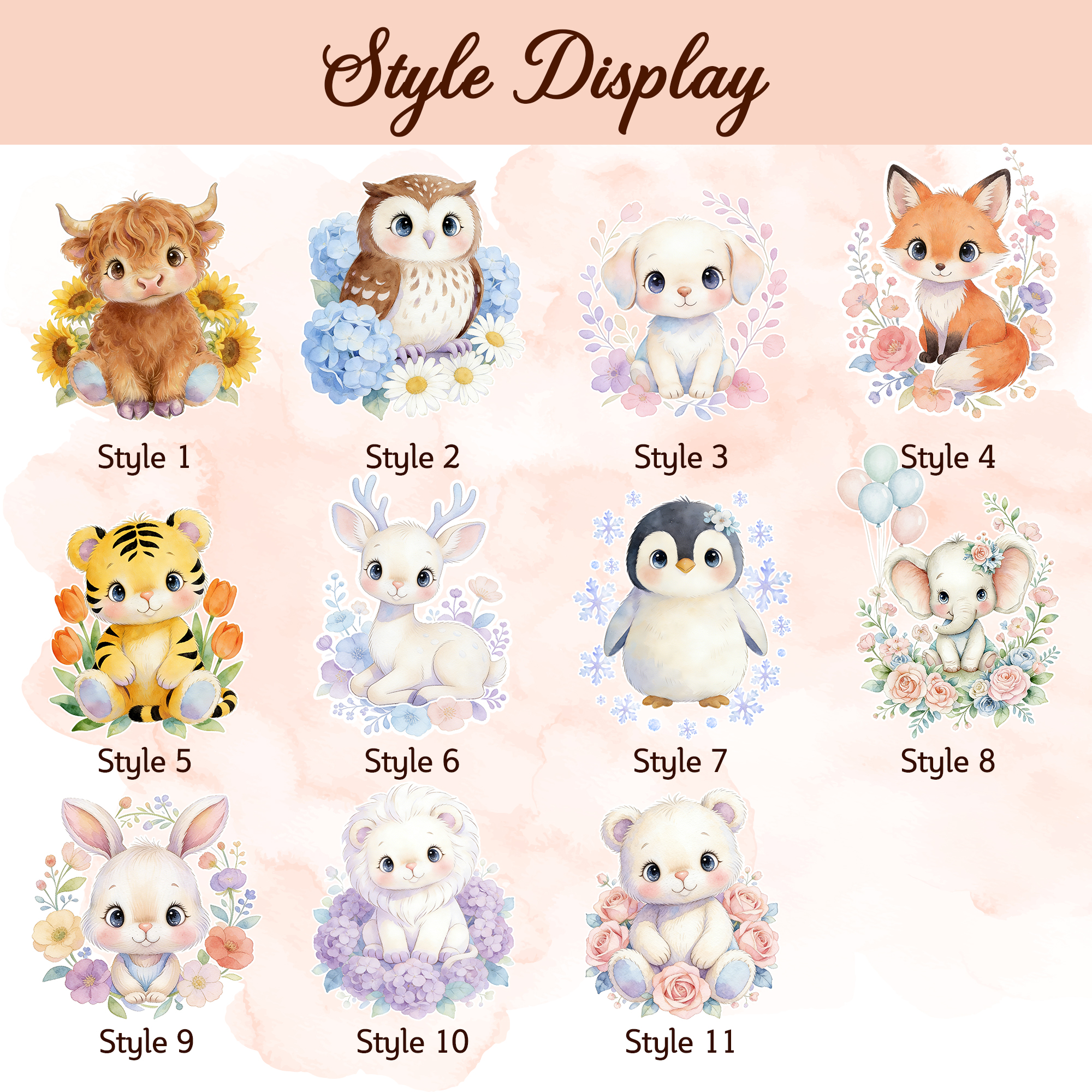 Adorable Animal & Floral – Choose from sweet animal styles, each surrounded by soft pastel flowers and springtime elements. From bunnies and foxes to owls and penguins, every character is illustrated in a gentle, watercolor-inspired style.