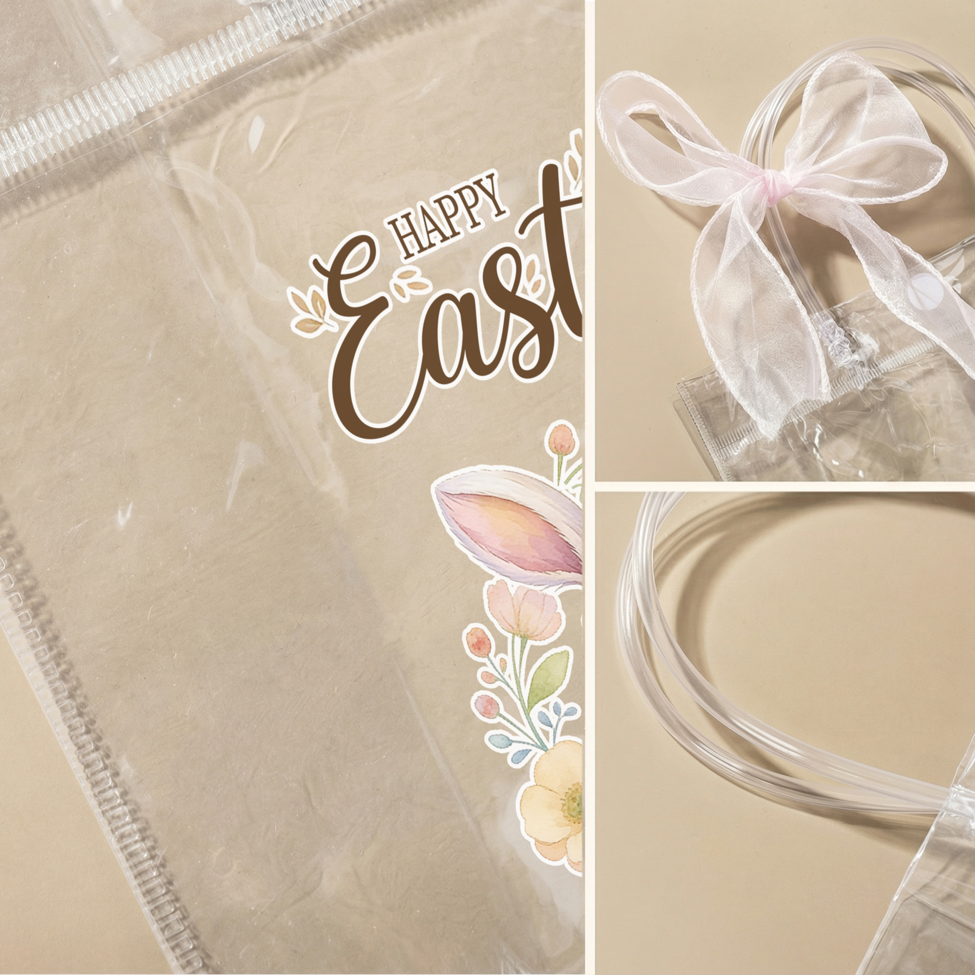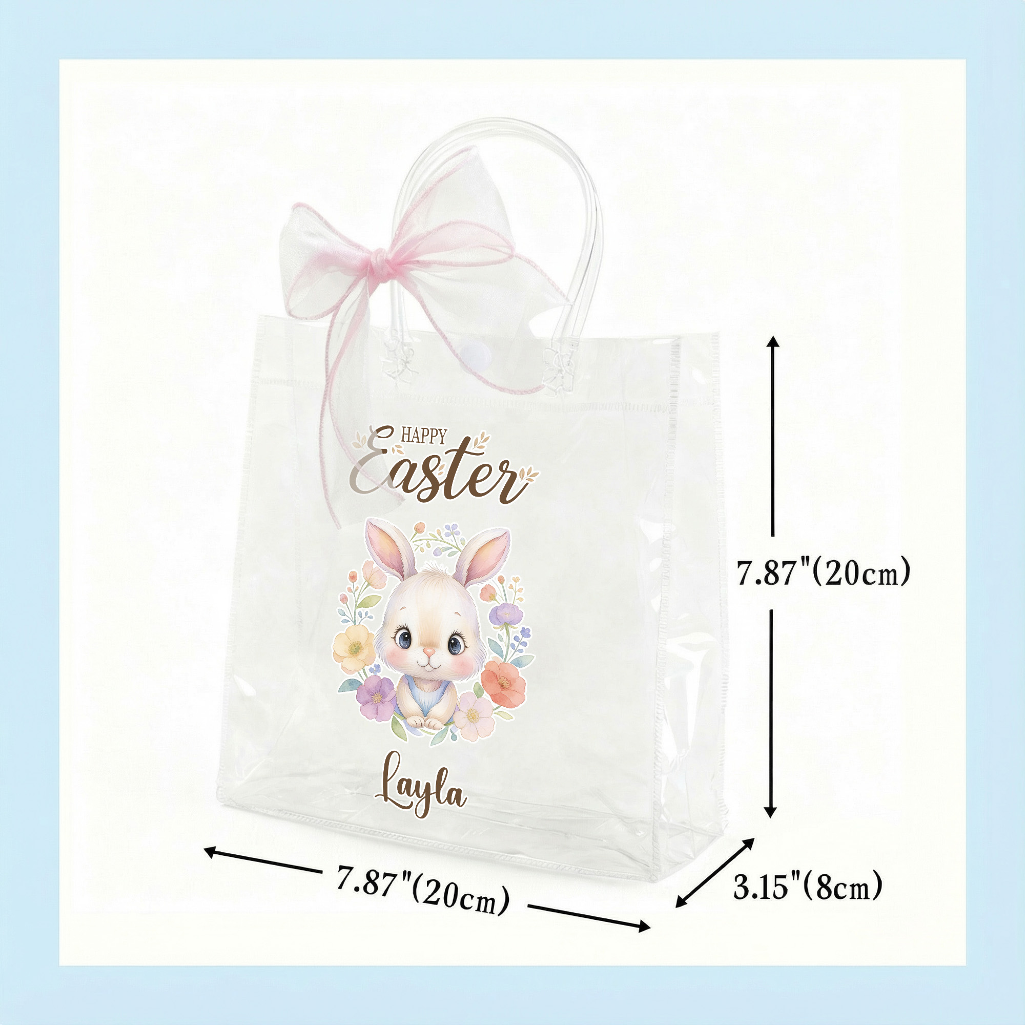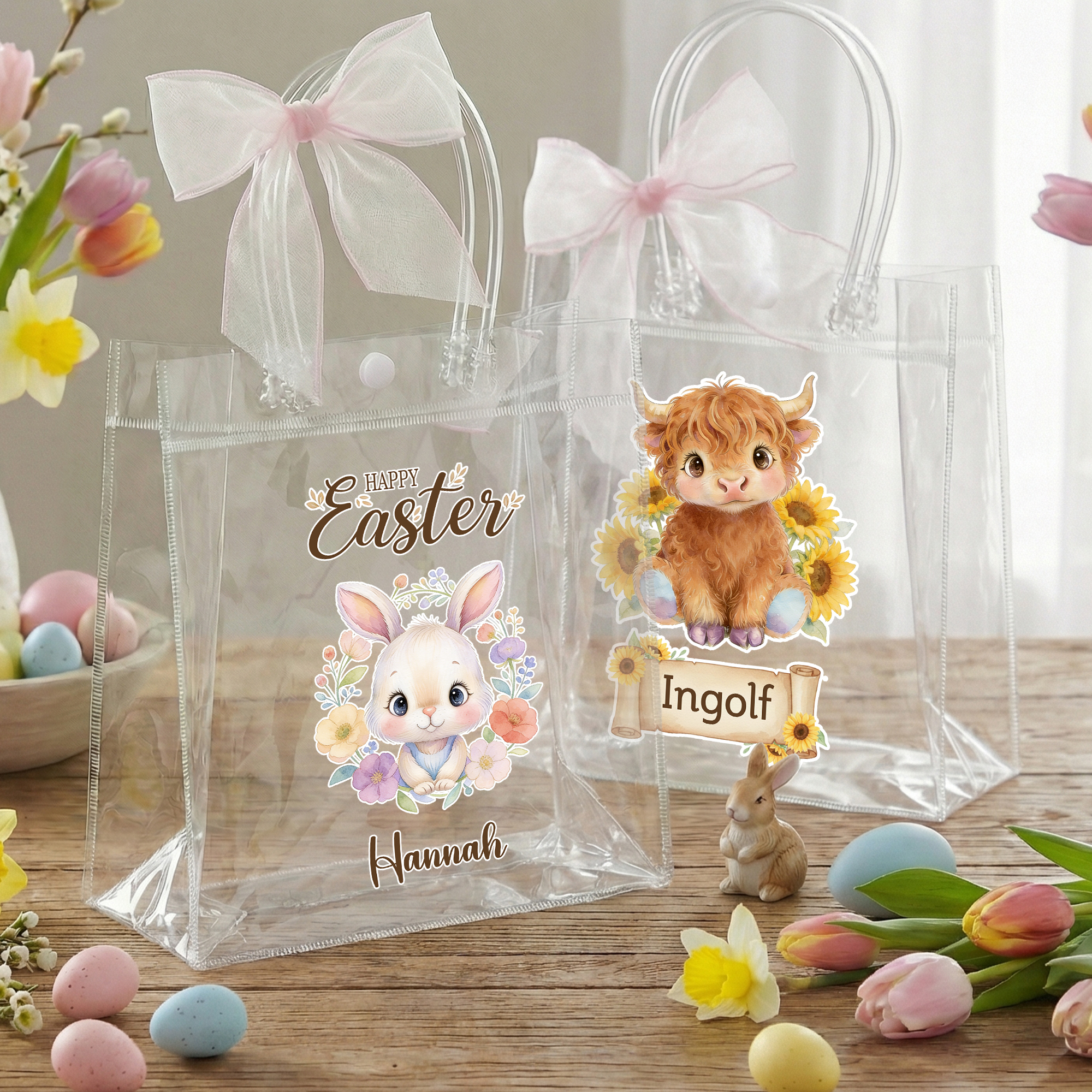 Personalized Name Easter Floral Animal Gift Bag with Pink Bow Ribbon, PVC Clear Egg Hunt Bag, Party Favor, Easter/Birthday Gift for Kids/Girls/Boys