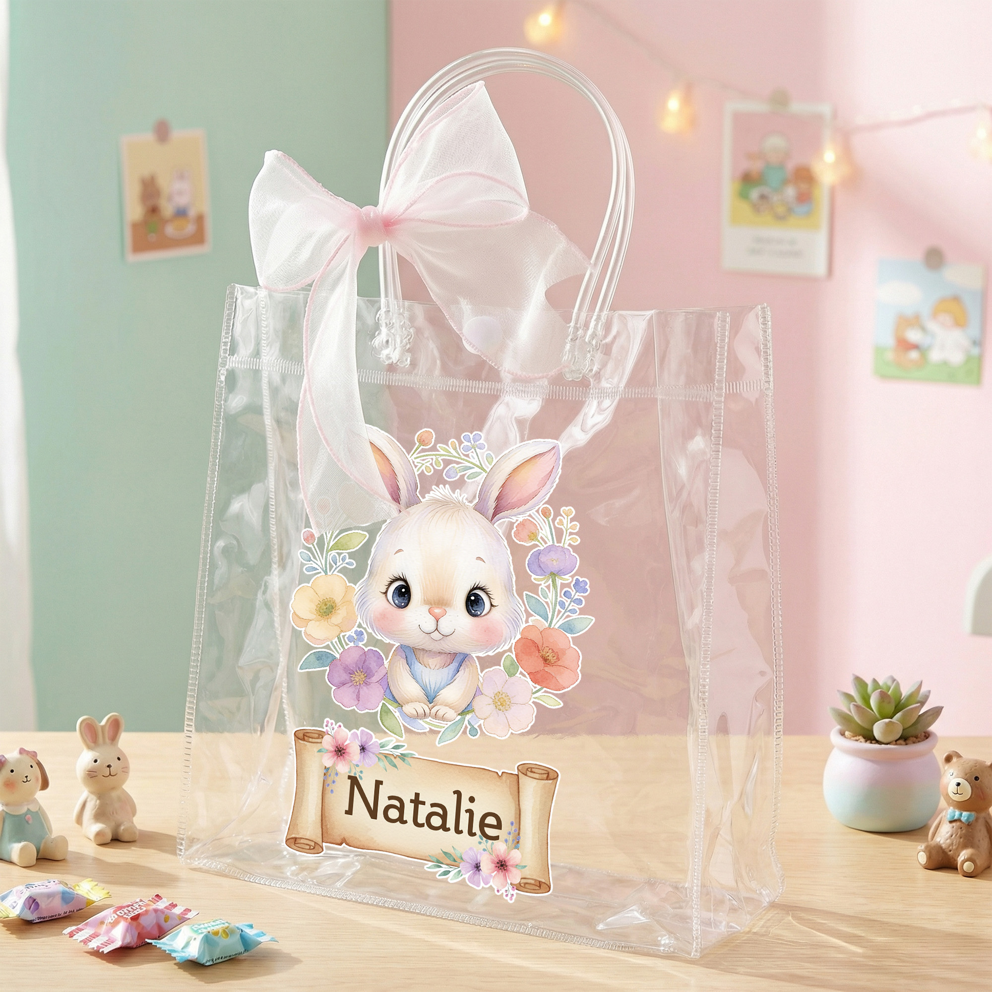 A Sweet Gift That Sparkles – Whether given as a party favor, Easter gift, or surprise treat, this personalized bag brings smiles and a sense of belonging. It’s more than a bag—it’s a moment of magic captured in clear and color.